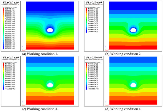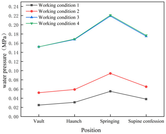 As shown in Figure 7, the water pressure equipotential line around the tunnel in condition 1 (normal condition) is relatively dense, indicating that the pore water pressure around the tunnel changes rapidly, and the groundwater is discharged through the tunnel through seepage movement. With the rapid blockage of the tunnel drainage system, the water pressure equipotential line around the tunnel changes from dense to sparse, and the change range of pore water pressure around the tunnel in condition 3 and condition 4 (blockage degree 80%) is small, indicating that the drainage function of the tunnel is seriously reduced. The pore water pressure of each part of the tunnel lining is as follows: arch foot > inverted arch > arch waist > arch crown.