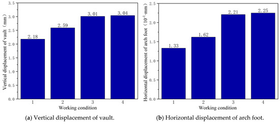 As shown in Figure 10, compared with condition 1, the vertical displacement of arch crown under condition 2 increased by 18.81%, while the horizontal displacement of the arch foot increased by 21.80%. Under condition 4, the vertical displacement of the arch crown increased by 39.45%, while the horizontal displacement of the arch foot increased by 69.17%. Through the comparative analysis of condition 1, condition 2 and condition 4, it can be seen that with the increasing blockage of the drainage system, the vertical displacement of the arch crown and the horizontal displacement of the arch foot of each part of the tunnel showed an increasing trend, and the increase in the horizontal displacement of the arch foot was greater than the vertical displacement of the arch crown. In addition, this trend was not nonlinear. With the increase in the blockage degree of the drainage system, the increase in the lining displacement also became more significant. The comparison between condition 3 and condition 4 shows that under the same blockage degree, the vertical displacement of condition 4 increased by only 1%, and the horizontal displacement of arch foot increased by 1.81% compared with condition 3. This is because the mechanical properties of the primary support concrete were reduced due to the crystallization of calcium carbonate. The results show that the displacement of the lining increased with the extension of the crystallization time of calcium carbonate in the initial support concrete. The increase degree of conditions 3 and 4 is small, which indicates that the influence of the initial support concrete crystallization on lining displacement is limited to within 0–40 d.