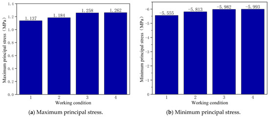 As shown in Figure 12, compared with condition 1, the maximum principal stress under condition 2 increased by 3.86%, while the minimum principal stress increased by 4.65%. Under condition 4, the maximum principal stress increased by 10.68%, and the minimum principal stress increased by 7.88%. The comparison of condition 1, condition 2 and condition 4 shows that the maximum and minimum principal stresses of the tunnel lining showed an upward trend with the increase in the blockage degree of the drainage system, which indicates that the stress of the tunnel lining was increasing. By comparing condition 3 and condition 4, it can be observed that under the same blockage degree, compared with condition 3, the maximum principal stress of condition 4 increased by only 0.3%, and the minimum principal stress increased by 0.2%. This is because the crystallization of calcium carbonate in the primary support concrete leads to a decline in its mechanical properties. The results show that the maximum principal stress and the minimum principal stress of the lining show an upward trend with the extension of the crystallization time of calcium carbonate in the initial support concrete. The increase degrees of conditions 3 and 4 are small, which indicates that the effect of initial support concrete crystallization on the stress of the lining structure is limited within 0–40 days.