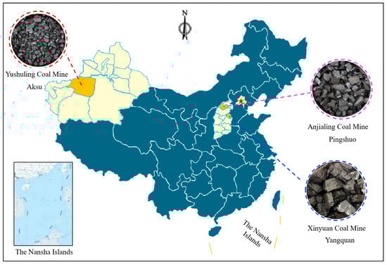 The experimental samples included lignite from Anjialing Coal Mine, fiery coal from Yushuling Coal Mine, and anthracite from Xinyuan Coal Mine, as shown in Figure 1. After sampling, the coal samples to be measured were broken, crushed, and screened, respectively. Experimental coal samples with a particle size of 0.20–0.3 mm were screened and placed in the oven for 6 h, and the drying temperature was 70 °C. Then, the samples were allowed to stand and cool down to 21 °C, sealed, and stored until being used.