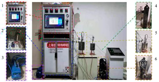 This experiment was carried out using an independently developed isothermal adsorption and desorption system that consisted of six main parts: a gas supply and gas control system, adsorption and desorption system, pressure collection system, vacuum degassing system, temperature measurement system, and desorption gas collection system. The test pressure range was 0–6 MPa, as shown in Figure 2.