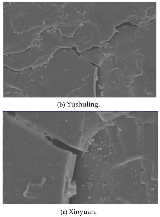 It can be seen from Figure 3 that the Anjialing, Yushuling, and Xinyuan coal samples all have obvious fractures and better pore development. By comparing the scanning electron microscope images of the three coal samples, it can be found that the surface of Anjialing coal samples is the most flat, and most of the cracks are brittle tensile cracks or shear cracks in the shape of a cross. The flatness of the Yushuling coal sample is the second-highest; the fracture morphology and pore morphology are similar to that of the Shuangliu coal sample, but the mineral particle filling is more obvious. The surface of the Yushuling coal sample has a large number of scaly structures and a large number of pyrolytic pores. From the above characteristics, it can be concluded that the pore development status of experimental coal samples is basically as follows: Anjialing < Yushuling < Xinyuan. This result can be explained by the relationship between coal metamorphism and porosity.