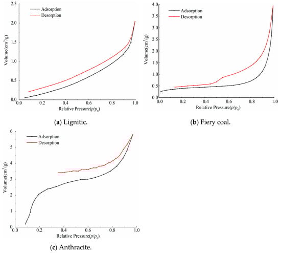 N2GA adsorption and desorption isotherms of coal samples. (a) Lignitic; (b) Fiery coal; (c) Anthracite.