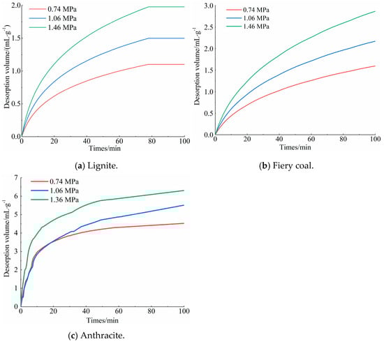 - Coal samples with a higher degree of metamorphism exhibited a faster attainment of the desorption limit value, whereas low-rank lignite required a longer period to reach this limit. However, as the desorption time increased, the desorption rate of highly metamorphic coal samples gradually declined, resulting in a progressively slower desorption rate.