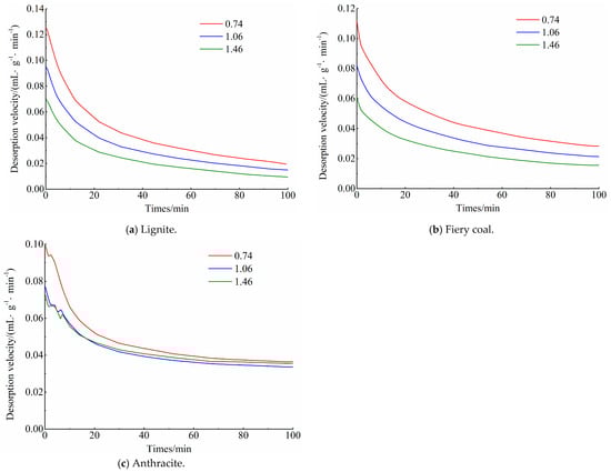 When the equilibrium pressure was 0.74 MPa, the intermediate metamorphic fiery coal exhibited the smallest initial desorption rate. As the desorption process continued, the desorption rate slowly decreased over the same duration. Remarkably, the initial desorption rate of anthracite, with a high degree of metamorphism, did not differ greatly from that of lignite, which had the lowest degree of metamorphism. However, as the desorption process continued, anthracite experienced the smallest decrease in desorption rate over the same duration, while lignite exhibited the greatest decline.