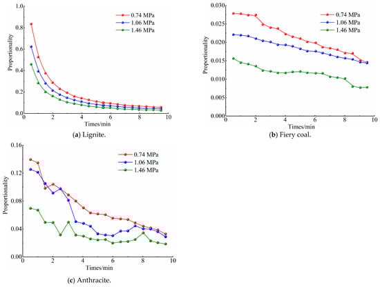 Proportionality of the desorption rate of coal under different gas pressures. (a) Lignitic; (b) Fiery coal; (c) Anthracite.