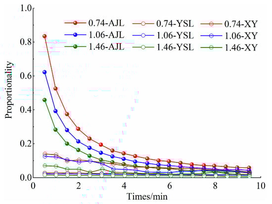 Data were collected at half-minute intervals during the initial 10 min, and a curve was plotted based on the difference between the former and latter groups. The ratio of the former group’s desorption rate to the latter group’s is presented in Figure 7 and Figure 8. It is evident from these Figures that the desorption rate curves for the three experimental coals exhibited distinct trends. The difference in desorption rate within the first 10 min under varying pressures was more pronounced for lignite compared to fiery coal and anthracite, implying a greater decline in desorption rate for lignite. Furthermore, the difference in desorption rate for lignite within the initial 10 min showed no significant variation between the first 4 min and the last 6 min, while the difference in desorption rate for fiery coal did not significantly differ from that of the last 6 min. The linear correlation between the ratio of differences in the desorption rate within the first 4 min was stronger than that of the last 6 min, and the linear correlation coefficient increased with the increase in gas pressure.