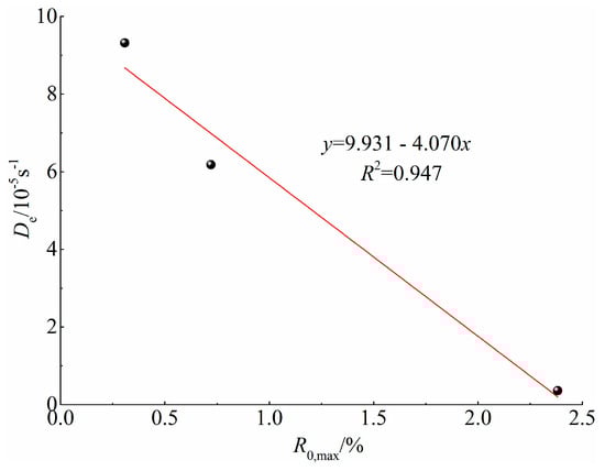 The relationship between the effective gas diffusion coefficient and the metamorphic degree of the coal samples was calculated based on the measured results for the maximum reflectivity of vitrinite and the effective gas diffusion coefficients. Figure 9 demonstrates this relationship. Figure 9 shows that there is a strong negative linear correlation between the effective gas diffusion coefficient and the maximum reflectance of vitrinite, indicating that the ability of gas to diffuse in coal decreases as the metamorphic degree increases. The variation in effective gas diffusion coefficients among coal samples with different degrees of metamorphism can be primarily attributed to the maceral components of the coal itself, as well as compaction and dehydration during the coalification process. Coals with a lower degree of metamorphism tend to have a higher content of inertinite and chitinite at the maceral level, resulting in abundant large pores within these macerals. These pores provide ample space for gas diffusion, facilitating the gas diffusion process.