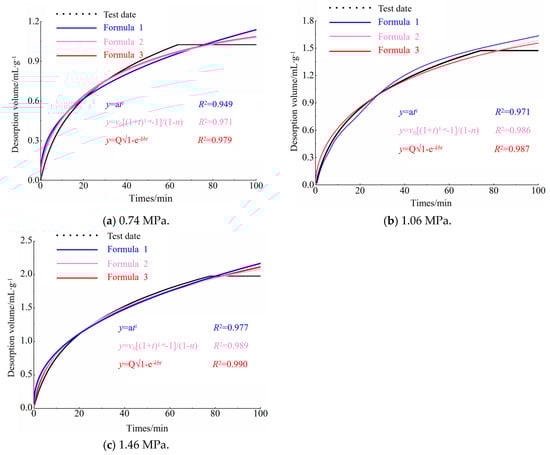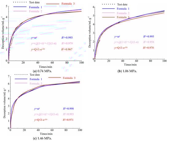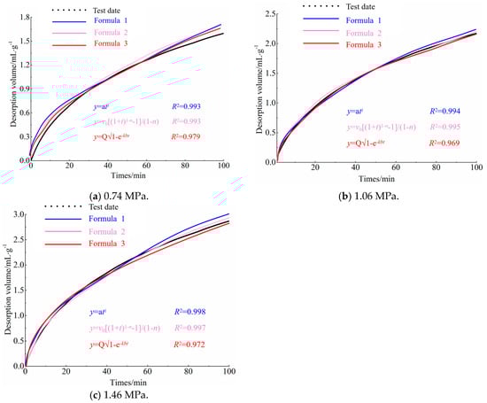 Desorption fitting curve for anthracite. (a) 0.74 MPa; (b) 1.06 MPa; (c) 1.46 MPa.