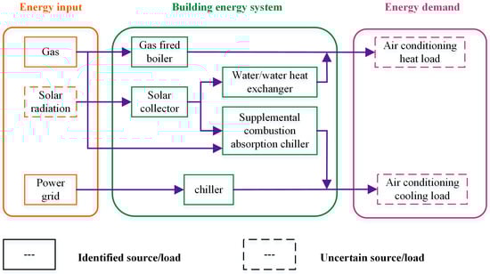 In terms of the low-carbon future building energy system, the building energy system can provide support for the future low-carbon/zero-carbon building in the three major directions of energy efficiency improvement, building production capacity, and building electrification [47]. Figure 2 shows a block diagram of the energy system of a building that uses a composite energy system to provide cooling and heat for the building. In terms of energy efficiency, there are two main methods [48]: first, more use of low-grade renewable energy; countries have successively used ground, water, and air sources in the renewable energy category. Solar photovoltaic photothermal energy, low-grade waste heat-driven refrigeration heating, and power generation technology are increasingly mature; the main bottleneck is how to improve source uncertainty or discontinuity (such as photovoltaic, thermal) and building energy system characteristics and how to overcome the source, water, sewage source, and heat resources constrained by the spatial and temporal distribution problem [49]. At present, new energy storage media and systems are being developed, and the construction method of low-carbon future building energy systems according to local conditions and multi-energy complementary methods is being studied to solve the problem of continuity and the spatial and temporal distribution of renewable low-grade energy [50].
