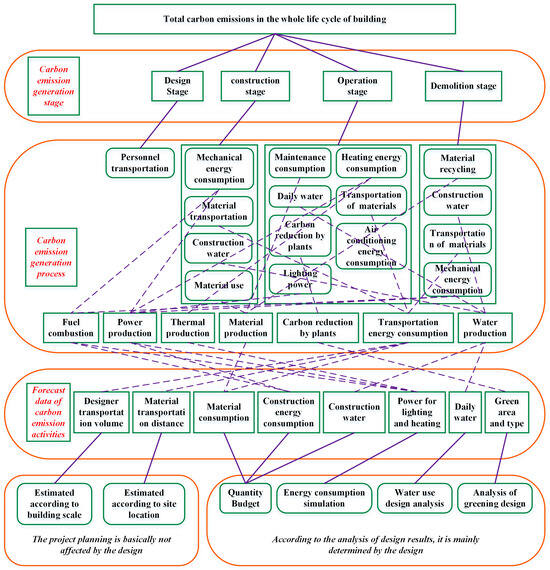 The development goal and path of green buildings have been defined, low-carbon building technologies and evaluation systems are being explored, and high-quality development support systems are gradually being improved [82,83]. At present, a standard system and corresponding indicator system focusing on green buildings and near-zero energy consumption buildings have been formed, which, to some extent, reflects the guidance of the low-carbon development of buildings. However, these standard systems generally focus on the conservation of building resources and energy, and there is still much room for improvement in the comprehensive and systematic aspects of carbon emission control [84]. In combination with the research results of the classification method of carbon emissions in the life cycle of buildings, we have determined the data correlation for each classification method to determine the evaluation factors of the design, and we have determined the factors that are relevant to the design as the basis for evaluating and optimizing the building design. The carbon emission types and data correlation determined by the three classification methods are shown in Figure 3.