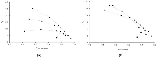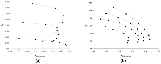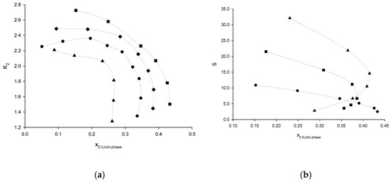 The ability of an entrainer to separate an azeotropic mixture is evaluated based on two key parameters: the distribution coefficient, K2, and the selectivity, S. The distribution coefficient indicates how much solvent is necessary for the process, as well as their suitability. This parameter shows how differently the solubility of ethanol in the IL-rich phase is with respect to its solubility in the water-rich phase. Their definition is shown in the Equation (3).
