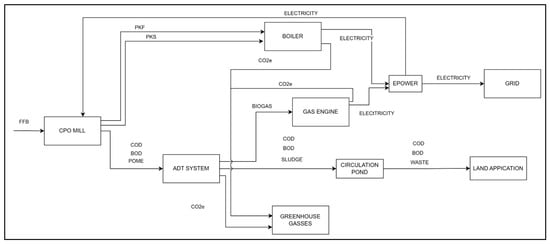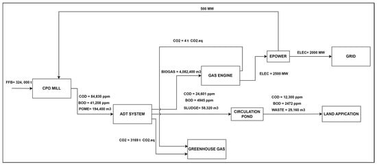 The complexity of advanced POME treatment technologies introduces operational challenges compared to conventional pond-based systems [4]. Emerging technologies, such as thermophilic continuous stirred tank reactors (CSTR) and mesophilic microbial electrolysis cells (MECs), have demonstrated promise in improving the treatment efficiency. Co-digestion processes, including oxidation by hydrogen peroxide (OHP), have been shown to enhance the renewable biogas yields [5,6]. Estimates indicate that processing one ton of FFB can produce approximately 20 m3 of biogas, while treating one ton of POME can yield around 28 m3 of biogas [7]. Additionally, one kilogram of COD in POME corresponds to 0.238 kg of CH4 emissions, with the reported values ranging between 6.54 and 6.67 kg of CH4 and 137–163 kg of CO2e per ton of FFB processed [8]. As POME is anticipated to remain a vital potential renewable energy source, the environmental impacts across various stages of the POME conversion process cannot be overlooked [9].