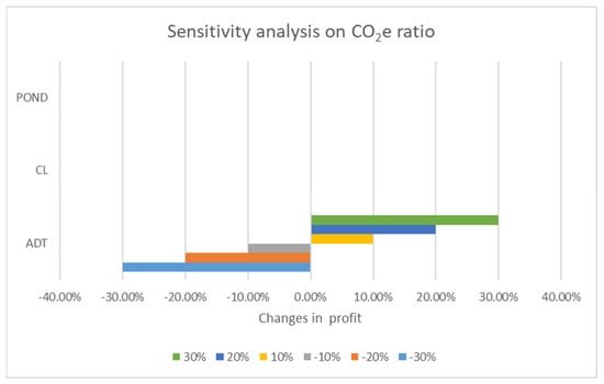 In contrast, the ADT category exhibits the most substantial negative response to reductions in the CO2e levels, particularly at −30% and −20%. These findings suggest that ADT is highly susceptible to decreases in CO2e, emphasizing the need to maintain adequate CO2e levels to prevent adverse impacts on its efficiency or effectiveness. The CL category, however, shows relatively moderate changes across the entire spectrum of CO2e variations. While it displays a positive response to increases and a negative response to reductions, the magnitude of these changes is less pronounced compared to POND and ADT. This trend indicates that CL may be less sensitive to fluctuations in CO2e, highlighting its potential resilience under varying carbon conditions.