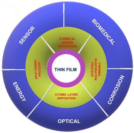 “Thin films” are film layers with thicknesses ranging from nanometers to a few micrometers that are deposited on substrates. A thin film can range in thickness from a nanometer to many micrometers []. Thin films are used to modify material surfaces or functional devices. The structure of a thin film, as evaluated at the nanoscale or micrometer scale, has a major impact on mechanical, optical, electrical, and thermal properties [,]. The primary characteristic of thin-film materials is their growing use in technology. Thin films are better understood in materials science and a wide range of applied and theoretical studies (Figure 1). In terms of materials science, thin films not only possess the properties of matter but also forecast the relationship between preparation techniques and material design []. Thin-film materials have been studied for energy and electronics applications such as electronic semiconductor devices, light-emitting diodes, thin-film solar cells, optical coatings, and thin-film batteries. In particular, the elemental composition of such films is of great importance because the structure and mechanisms are based on the materials. The preparation method used to make a thin film and the inherent growth factors of the film greatly affect the structure. The distinctions between thin films and thicker materials are determined by the thickness. Small changes in thin-film growth may result in additional changes in thin-film properties across the nano-to-microscale range [].