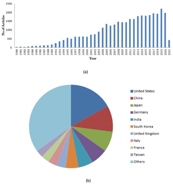 Global trends in thin-film technology: (a) representation of the year-wise publications of research articles indexed in the Scopus database; (b) geographical distribution of patents on thin films (reproduced with permission from reference [] (open access).