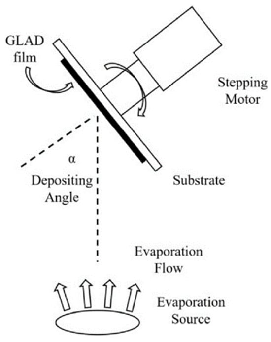 Diagram of glancing angle deposition film preparation (reproduced with permission from reference [], © 2022 Optica Publishing Group under the terms of the Optica Open Access Publishing Agreement).