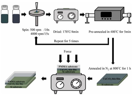 Spin-coating is a laboratory-scale process that involves depositing a small amount of solution into the center of a solid substrate and spinning the substrate at high speeds (1500–6000 rpm). This results in a homogeneous layer. The spin-coating technique is influenced by fluid viscosity and density. One advantage of the approach is that it produces a homogeneous, high-quality coating. The downside is that it requires precise management and a clean atmosphere. Heating and UV/IR irradiation can be used to accelerate the process of the preparation of multiple layers. For example, the CuO/AlN film and CuAlO2/AlN thin-film preparation procedures are presented in Figure 6 [,,].
