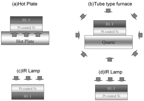 In liquid-phase fabrication, the synthesis takes place in an atmosphere with a relatively low temperature. The sol–gel process is a flexible solution process for producing glass and ceramics. As the name implies, the materials transition from a liquid solution to a solid gel. First, precursor solutions are synthesized based on the thin-layer composition and chemical procedure. Then, a homogeneous precursor layer of controlled thickness is created to coat the substrate. Finally, thermal treatment converts the deposited precursor layer into a crystallized final oxide layer, which may be either amorphous or nanocrystalline [].