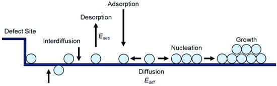 Several unique phases occur during the development of thin films, and each has an irreversible impact on the final film microstructure and physical properties. Nucleation by aggregation, random deposition caused by the aggregation of diffusing atoms, terrace diffusion, and atom potential upward are all important in thin-film growth []. Figure 3 displays a typical thin-film growth process that involves depositing atoms onto a substrate. All thin films undergo random nucleation, followed by growth stages. The earliest stages of thin-film growth include island growth, nucleation, coarsening, coalescence, and percolation. Thin-film growth based on deposition levels requires control of the thin-film growth temperature, pace, surface chemistry, nucleation, and growth phases []. In addition, external factors such as electron beams or ion bombardment can influence the nucleation process. Thin-film formation is influenced by the deposition process, microstructure, film tension, and associated defect structures. Moreover, thin-film deposition parameters determine the crystal phase and orientation of the resulting thin films. The reaction conditions, structure, and deposition procedure all affect the thermal and mechanical properties of thin films [,].