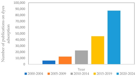 In the last decades, the scientific literature described a variety of adsorbent materials with an optimized design used in dyes removal for wastewater treatment. The interest in this subject area increased (Figure 1). Considering their ecotoxicological effects, dyes are considered primary hazardous materials in textile effluents, which may affect the physical and chemical properties of water resources if they are discharged without an efficient treatment [31,32,33,34,35,43,44,45,46,47,48,49].