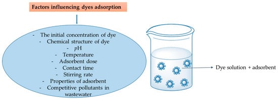 The adsorption capacity of the adsorbent materials is clearly influenced by several parameters: initial dye concentration, the adsorbent concentration, temperature, dye particle size, pH, contact time, etc., as shown in Figure 2 [33,34,35,36,37,38,39,40,41].