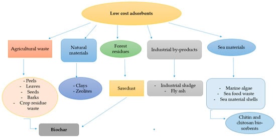 Biogenic adsorbents have in their structure bioactive components that could interact with functional groups of various pollutants, thus resulting in their binding capacity with the adsorbent. These sorbent materials can be modified by different methods, mechanical, chemical or thermal procedures, to enhance their adsorption capacity [51,52,53,54,55,56,57,58,59,60,61,62,63,64].