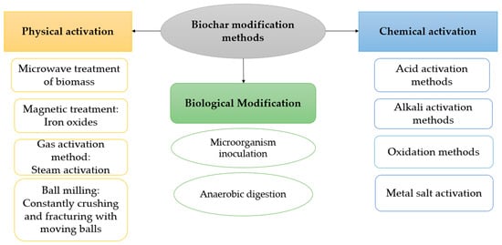 Biochar is a sustainable and eco-friendly material that has drawn a lot of attention for its use in adsorption processes. Researchers studied the production and modification of biochar from household waste, livestock manure, agricultural and forestry waste. The application capacity of modified biochar can be enhanced by changes in its pore structure, specific surface area, content of surface functional groups and functionalization of its physical and chemical characteristics [54,55,56,57,58,59]. Pre-treatment of raw materials, control of pyrolysis parameters, impurity removal and product modification are examples of modifications [54,55] that can be made during or after the preparation process of biochar (Figure 4).