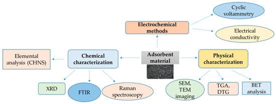 In order to confirm the use of a proposed biogenic adsorbent and to determine its efficiency in the adsorption process, the characterization of the sorbent material is essential (Figure 5). Many methods are used for identifying, locating and quantifying chemical components, including functional groups, molecules and elements. These methods facilitate a complete examination of the adsorbent characteristics: the structure, size, magnetic properties and morphology of these materials. Physical and chemical investigations are the two main types of adsorbents characterization methods [28,29,30,31,32,33,34,35,36,42,43,44,45,46,47,48,49,50,51,52,53,54].