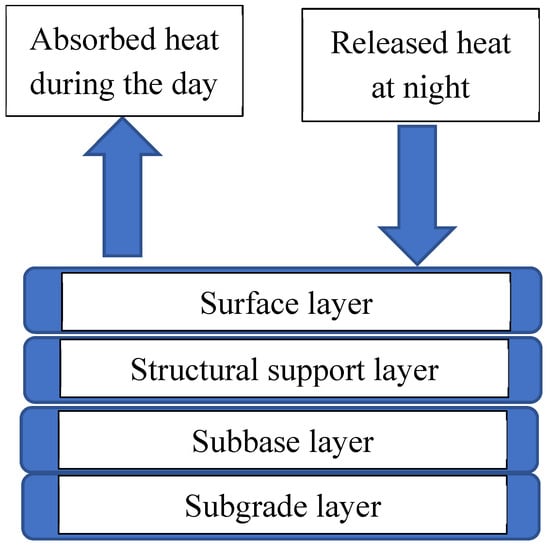 A schematic diagram of asphalt pavement layers with absorbed and released heat.