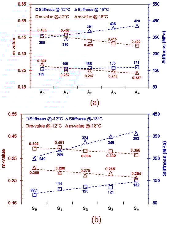 Assessment of EP-CPCM augmented base (a) and SBS (b) on asphalt binders for creep stiffness and m-value at low temperatures [24] (Reproduced with permission from Construction and Building Materials by Elsevier, 2024; Order Number: 5874491465554).