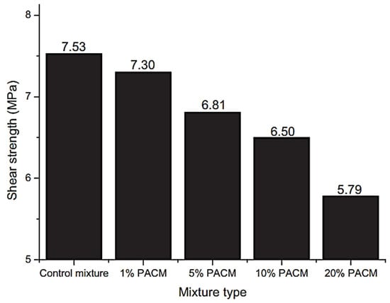 The association between asphalt and PEG was studied in 2019 by Du et al. [26]. Their study concentrated on its potential phase change impact, and a series of laboratory experiments were conducted. These comprised a rheometer test of dynamic shear, a microscopic test, a test of shear strength, and an indoor irradiation test. The tests allowed the analysis of the PCM’s impact on the asphalt/asphalt mixture’s efficiency. The researchers found that the calculated value of the phase transition enthalpy of the PEG/asphalt composite was bigger than what was predicted by the theoretical results. According to the Fourier Transform Infrared Spectroscopy (FTIR) spectra and fluorescence pictures that were analyzed, the PEG was found to be uniformly dispersed at a low concentration throughout the asphalt. Furthermore, the results obtained from the frequency and temperature sweep tests presented a suggestion, which was that the liquid condition of the PEG would be able to enhance the elastomeric quality of the PAC (the pure asphalt component). The PEG/asphalt combination that included 20% PEG had a peak temperature that was lesser than the control asphalt mixture’s by 3.3 °C. Figure 5 illustrates that the strength of the shear of the asphalt/PEG arrangement was 20.3% less than the shear strength of the control asphalt mixture.