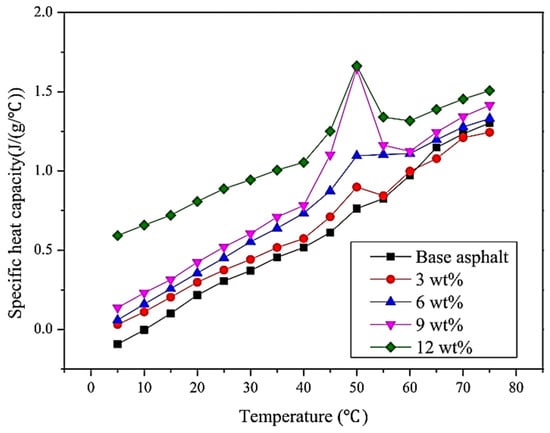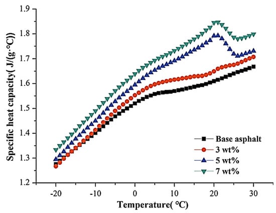 In 2019, Wei et al. [28] used the prepolymer approach to fabricate a polyurethane solid–solid PCM that has a low temperature of phase change. The deformation resistance at high temperatures of the improved asphalt steadily increased when the fraction of polyurethane solid–solid PCM grew with improving amounts. The performance of the asphalt at low temperatures was enhanced when using a polyurethane solid–solid PCM for temperatures below −18 °C. The enhanced asphalt’s specific heat capacity (Cp) steadily rose with the increase in the quantity of the polyurethane solid–solid PCM. As can be seen in Figure 6, the specific heat capacity of the modified asphalt reached its apparent high somewhere between 13 °C and 25 °C when the fraction of polyurethane solid–solid PCM was more than three percent by weight. As the PCM concentration increased across the fraction’s spectrum, the amended asphalt’s coefficient of heat conductivity progressively increased.