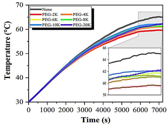 In 2021, Jia et al. [32] conducted research on PEG to investigate its phase change behaviors and its heat stability. It has been proven that PEG samples with a mean molecular weight in the range of 2000–20,000 (PEG-2K–20 K) have favorable phase transition temperatures in the range of 41.27 °C to 62.39 °C and moderately high latent heats in this range (184.8 to 211.9 calories per gm), with outstanding thermal stability at temperatures below 300 °C. Due to the detrimental effect that PEG has on the asphalt binder’s high- and low-temperature capabilities, as well as its temperature and stress sensitivity, it is imperative that PEG be encapsulated prior to its application. Figure 7 depicts the temperature–time curves of the basic binder as well as those of the PEG-modified binders, which may be used to verify the temperature regulation effects. At the beginning of the heating process, the thermal conductivity of all of the binders that have relatively few variances in their heating rates is comparable. PEG-modified binders, on the other hand, have temperatures that rise at a pace that is progressively slower than the base binders’ temperature after the temperature reaches roughly 52 °C and above.