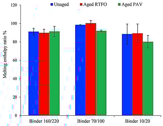 In 2019, Kakar et al. [45] investigated whether or not it would be possible to use microencapsulated PCMs in asphalt binders. As a result, many distinct penetration-grade binders that had been changed with microencapsulated PCMs were characterized, and their blends were artificially aged with the assistance of machines known as rolling thin film ovens (RTFOs) and PAV. Additionally, this research inspected a variety of size distributions of microcapsules. The rheological and thermal features of modified and unmodified asphalt binders that had been exposed to a diversity of ageing conditions were analyzed using techniques of Dynamic Scanning Calorimetry (DSC) and Dynamic Shear Rheometry (DSR). It was exposed that when improved asphalt binder ages, its melting enthalpy drops, and this decrease is dependent not only on the kind of binder but also on how long the binder has been aged, as depicted in Figure 9. Referring to the findings, the ability of microencapsulated PCMs to survive in asphalt binders is reliant on not only on the kind of binder but also on the microcapsules that are used. Furthermore, the thermal energy released by PCM crystallization throughout the cooling process has a contribution to improving the modified asphalt binder’s rheological parameters, which are assessed by DSR.