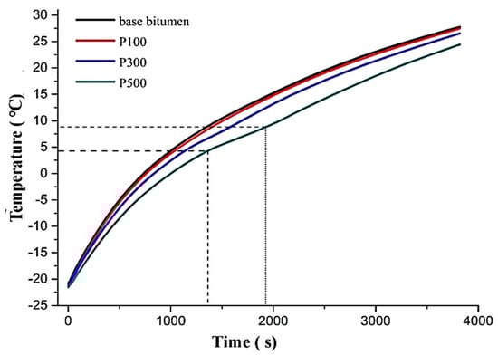 An asphalt binder that was modified using microencapsulated phase-change materials (micro-PCMs) was considered in 2019 by Wei et al. [46] to analyze its impact on the physical features of asphalt, storage stability, and temperature-adjustable performance. In situ, polymerization is used to produce micro-PCMs that have n-tetradecane cores and melamine–formaldehyde (MF) resin shells. Various quantities of micro-PCM modifiers have been added to a neat asphalt binder in order to modify its properties. For the micro-PCM-enhanced asphalt and with an increase in the amount of micro-PCMs present, the temperature change rate near the temperature at which the micro-PCM transition from one phase to another is slowed down. The temperature-rise curves of bitumen specimens that have been treated with micro-PCMs are presented in Figure 10. According to the data shown in this figure, there are no discernible changes between the curve of bitumen samples changed with less than 3 wt.% of micro-PCM concentration and that of the unmodified bitumen. The slope of the curve, however, undergoes a minor shift between 4 °C and 9 °C when the amount of micro-PCM in the sample approaches 3 wt.%.