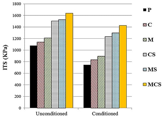 In 2020 and referring to HMA, Amini and Hayati [48] incorporated nano-CuO as a PCM, Styrene-Butadiene-Styrene (SBS), and carbon nanotubes (CNTs) as a conductive material, individually as well as composed in five different mixtures. The thermal energy storage (TES) in PCM-modified asphalt binders has been increased. Additionally, the melting peak temperature increased compared to the temperature of the pure asphalt binder, the transition temperature of glass was significantly increased, and the crystallization peak temperature decreased by 7 °C. Asphalt binders that were treated with nanoscale amounts of CuO showed a considerable improvement in their Cp, as well as a reduction in their sensitivity to temperature and moisture. Figure 11 shows the findings of the indirect tensile strength testing performed on materials that had not been conditioned and samples that had been conditioned. It was shown that the addition of the additives, in any combination, resulted in an increase in the tensile strength of the asphalt mixture in comparison to the standard asphalt mixture.