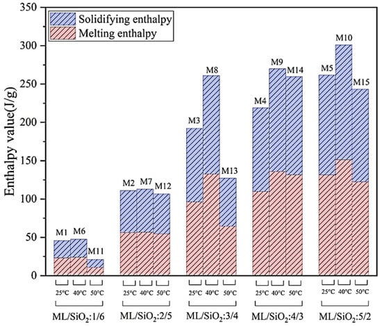Comparison graphs of PCM composite enthalpies at various reaction temperatures and ML/SiO2 ratios: 1/6, 2/5, 3/4, 4/3, 5/2 [61] (Reproduced with permission from Journal of Energy Storage by Elsevier, 2024; Order Number: 5874520830145).