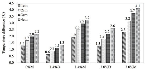 After conducting their research in 2021, Kuai et al. [62] addressed the issue of the open-graded friction course (OGFC) being subject to clogging during the summer months as a result of high temperatures inside the system. In order to solve this problem, they updated it by including a phase change composite material known as PEG/SiO2. This material was made up of plate number 1 as its core and SiO2 as its shell. Using slab specimens that varied in PEG/SiO2 dosages and moisture conditions, the research proved that PEG/SiO2-modified OGFC is successful in maintaining the temperature of the pavement. This was accomplished using laboratory-scale indoor heating testing. In addition, a three-dimensional heat transfer modeling technique was used in order to provide a description of the temperature field of the slab as it was being heated. A comparison is shown in Figure 14 between the reference slab and the moisture or (and) PEG/SiO2-modified OGFC slabs at a variety of depths. The comparison also includes the greatest temperature drop that was obtained by the reference slab. There is a direct correlation between the depth of the slab and the temperature drop that it experiences. It is possible that the temperature of the slab might decrease by a maximum of 4.1 °C at a depth of 4 cm in the situation when M is 3.0% and there is both moisture and the maximum dosage of PEG/SiO2.