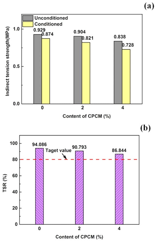 In 2021, Wang et al. [63] utilized a diatomite-supported PEG composite as a filler to achieve a self-regulating temperature characteristic in asphalt mixtures. At a composite percentage of approximately 4% in the material, the self-regulating temperature fluctuation could reach up to 7.3 °C. The influence of composite PCMs on road performance was negligible and could be overlooked, although there was a possibility of affecting mechanical characteristics, high-temperature stability, water stability, and microstructures. Despite a decrease in water stability with increased composite material, all specified parameters in the specification were met. Figure 15 illustrates a modest reduction in indirect tension strengths for the CPCM-treated asphalt mixture. The indirect tension strength ratio (TSR) values remained relatively stable at around 90%, with minimal shifts even after undergoing freeze–thaw cycles. Despite the apparent lower water stability in the CPCM-modified asphalt mixture, it still met the required criteria.