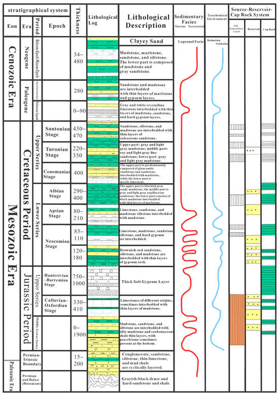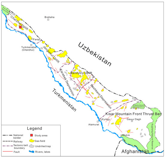 The Amu Darya Right Bank Gas Field is located in the Amu Darya Basin (as shown in Figure 1), a large Mesozoic superimposed sedimentary basin in the southeastern part of the Turan Platform. The basin’s basement is composed of Paleozoic igneous and metamorphic rocks. Above the basement, a sequence of layers is developed, including the Permian–Triassic terrestrial clastic transition layer, the coal-bearing sand and mudstone of the Middle and Lower Jurassic coastal plain-shallow marine facies, the marine carbonate rocks and evaporites of the Upper Jurassic, and the carbonate rocks, evaporites, and sand-mudstone of the Cretaceous–Paleogene. The basin’s tectonic structure and sedimentary cover distribution are mainly controlled by two sets of faults trending northwest and northeast [1].