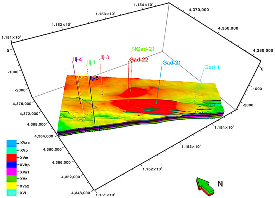 A fault model is established using the fault data interpreted from seismic data. Based on the interpreted seismic layers and combined with the geological stratification data of each small layer, a stratigraphic and structural framework model is built [23]. The model results of the study area are shown in Figure 3 below. (Among them, XVac, XVp, XVm, XVhp, XVa1, XVz, XVa2, and XVI are the main target layers of the study area, belonging to the Kallov–Oxford stage.)