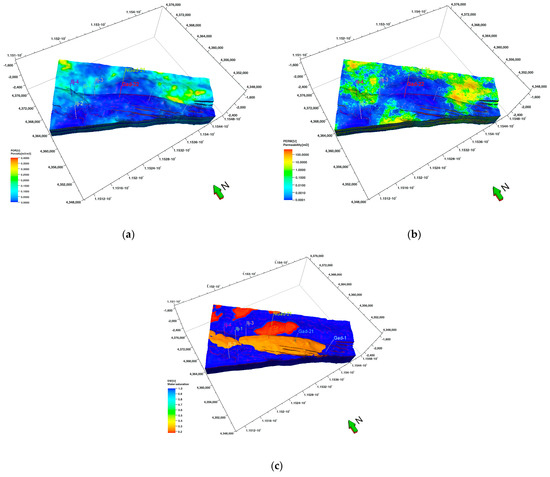 Using the results of seismic impedance inversion as constraints, the sequential Gaussian simulation method is applied to establish the three-dimensional spatial distribution of reservoir properties. The basic parameters of the model for the study area are shown in Table 1. The reservoir property model for the study area, established based on the parameters in Table 1, is shown in Figure 4, which includes (a) the porosity model, (b) the permeability model, and (c) the water saturation model.