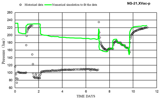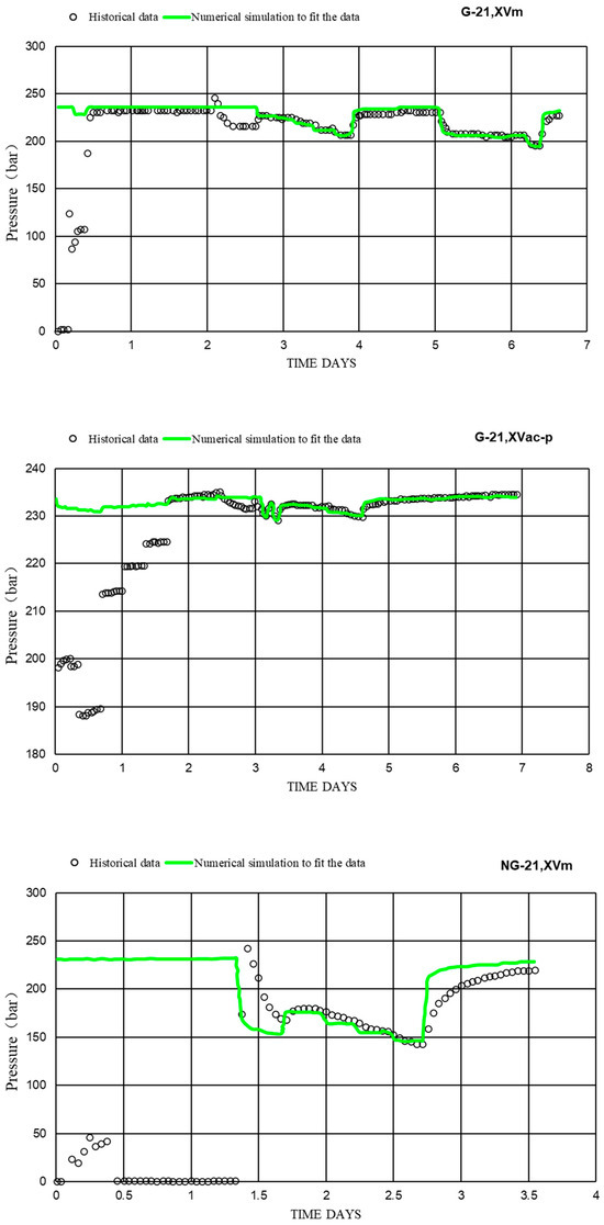 A numerical simulation model of the gas reservoir was established based on the geological model of the study area, and a history matching study was carried out. The specific fitting results are shown in Figure 5 below. As can be seen from the figure, the fitting results show a high degree of agreement with the historical data. Through calculations, we have determined that the single well fitting rate in the study area exceeds 90.2%.