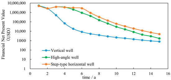 By calculating and analyzing the financial net present value (FNPV) of different well types in the multilayer thin gas reservoirs of the study area, the profitability of different well types over the long term can be quantified. The application of the NPV model indicates that selecting the appropriate well type can not only effectively reduce development costs but also increase the overall return rate of the gas reservoir. The analysis results using the single well FNPV model for the study area, as shown in Figure 7, demonstrate that stepped horizontal wells perform better economically compared to traditional vertical wells and conventional horizontal wells.