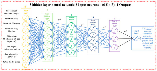 In the well grid optimization process, a Deep Neural Network (DNN) model is used for prediction to accurately estimate the key development parameters. The specific process structure is shown in Figure 8. First, eight parameters closely related to well grid optimization are selected for the input layer: average permeability, permeability variation, permeability rhythm, effective thickness of gas layers, gas layer thickness ratio, gas viscosity ratio, water multiple, and initial interlayer pressure difference. These parameters are represented as input vector x = [x1, x2, …, x8], which are processed through weighted summation and activation functions at the first layer before being passed layer by layer to the hidden layers in the network.