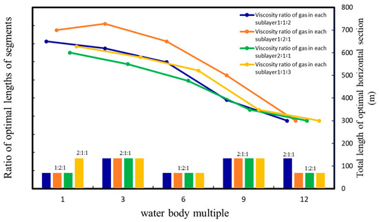 Optimal horizontal segment length and length ratios under different water drive multiples and gas viscosity ratios of each sublayer.