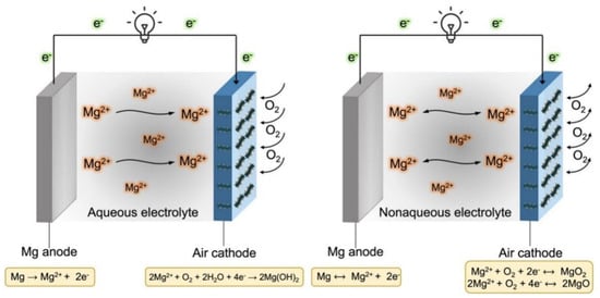 In contrast, with the aprotic (nonaqueous) electrolyte, the discharge products are MgO and/or MgO2, as given by Equations (4) and (5). A basic Mg–Air battery schematic configuration with both aqueous and aprotic electrolytes is shown in Figure 1, along with the reactions at the anode and cathode sides.