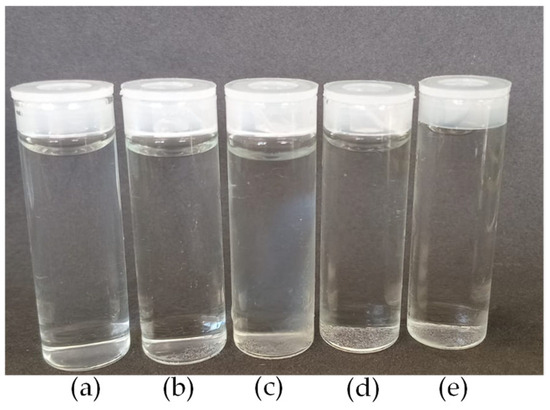 Images of nanoparticles: (a) CS; (b) CS/β-GP_0.05; (c) CS/β-GP_0.10; (d) CS/β-GP_0.20; and (e) CS/β-GP_0.25.
