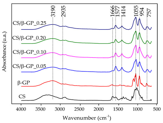 Figure 4 presents the FTIR spectra of CS/β-GP_0.05, CS/β-GP_0.1, CS/β-GP_0.20, and CS/β-GP_0.25, highlighting the decrease in the absorption peak at 1666 cm−1, attributed to the C=O bond from the amide functional group present in chitosan. This reduction indicates its interaction with the phosphate (PO) groups of β-GP [17].